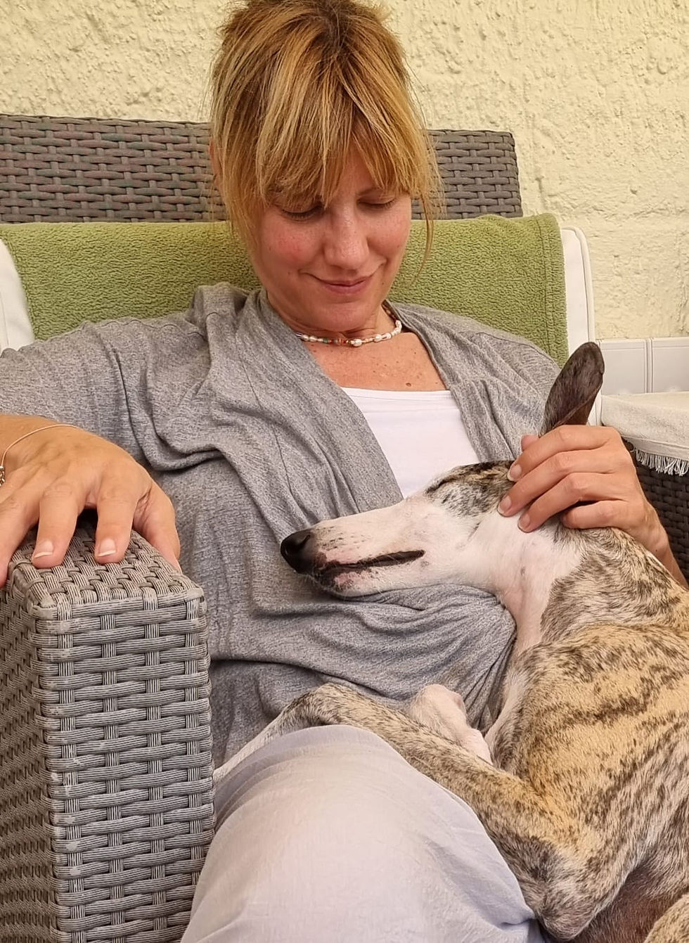 Sabine zählt zu ihrem Rudel neben den spanischen Galgos Kiwi, Willy, Ziggi und Lola noch eine kleine Wüstenprinzessin namens Pippa aus Abu Dhabi.